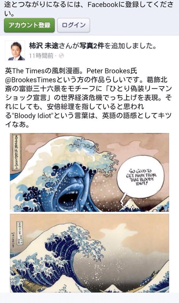柿沢未途衆院議員もフェイスブックに風刺画を掲載し、「こんなのが英国を代表する高級紙に掲載